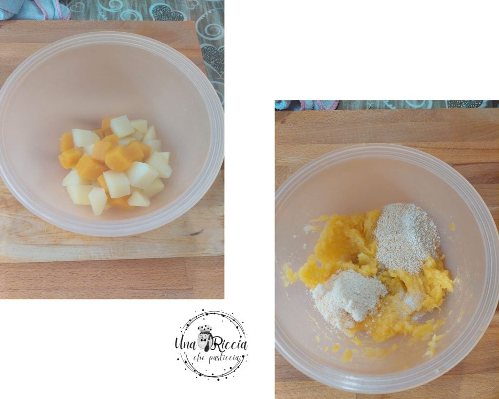 Cuando la calabaza y las patatas estén cocidas, las escurrimos con una espumadera en un bol y luego las aplastamos con un tenedor o un prensapatatas, en este punto añadimos los demás ingredientes, así que el pan rallado, el queso parmesano rallado, una pizca de sal y una molida de pimienta.