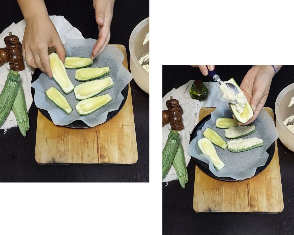 Lavamos y cortamos los extremos de los calabacines, luego los cortamos por la mitad a lo largo y los vaciamos de la parte interna con la ayuda de una cucharita o de un ahuecador de frutas. Recordemos reservar unos 20/30 gramos de pulpa de calabacín para poner en el relleno.