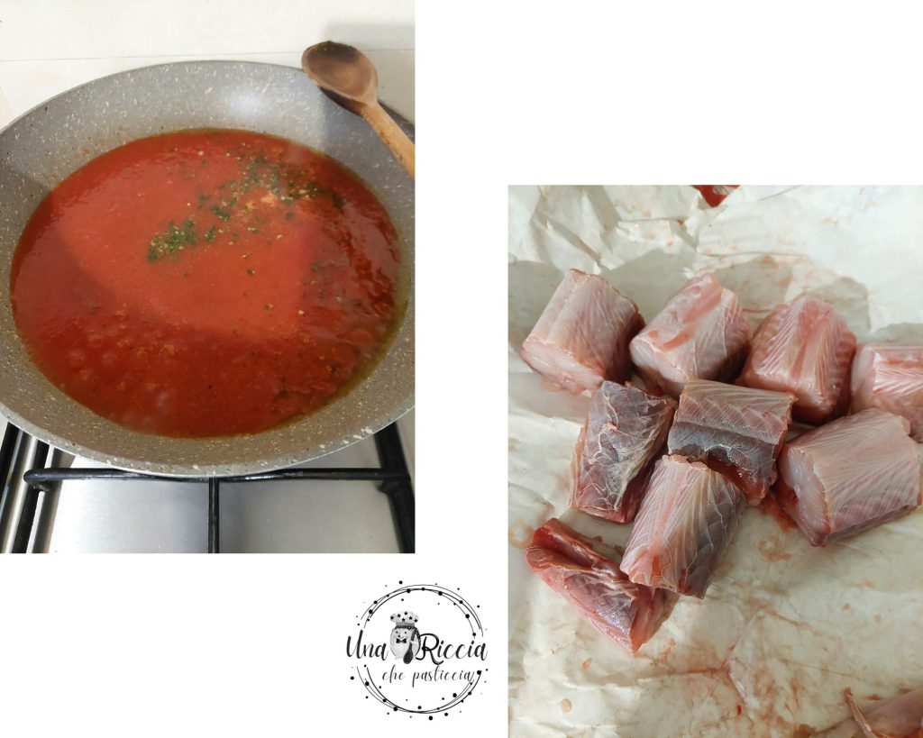 Vertemos el vino blanco en la salsa de tomate y dejamos evaporar el alcohol, luego colocamos los trozos de pescado en la salsa y cocinamos durante 5/6 minutos, giramos los trozos de pescado, ajustamos de sal y completamos la cocción. Si la salsa se espesa demasiado, añadimos un poco de agua.