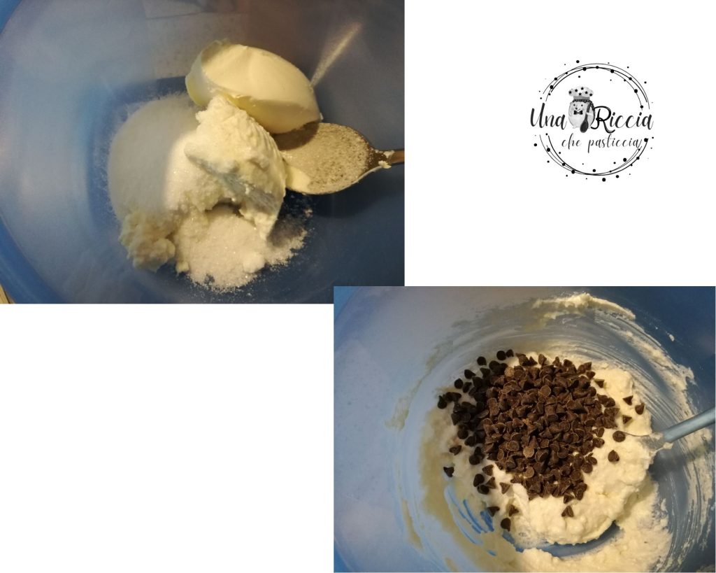 Mientras tanto preparamos la crema de ricotta. En un bol ponemos la ricotta bien escurrida, el mascarpone y el azúcar, luego mezclamos para integrar todos los ingredientes, en este punto añadimos las gotas de chocolate y mezclamos de nuevo.