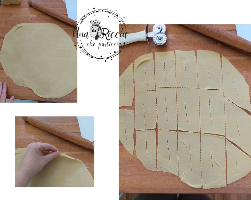 Pasado el tiempo de reposo retomamos nuestra masa, tomamos una parte y la extendemos con el rodillo o con la máquina para pasta. Debemos extender una lámina fina de 1 milímetro para que nuestras chiacchiere queden bonitas, burbujeantes y crujientes. Una vez conseguida la lámina, cortamos rectángulos o rombos con un cortador dentado y hacemos un corte en el centro de cada uno. Continuamos hasta terminar la masa.