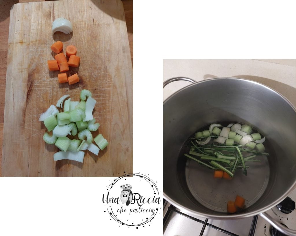 Para preparar las costillas de col negra con stracciatella de huevo necesitaremos caldo vegetal, puedes usar uno ya preparado o hacerlo hirviendo un litro de agua con un trozo de zanahoria, uno de cebolla, un poco de apio y algunas costillas de col negra. Sala y deja cocinar por buena media hora.