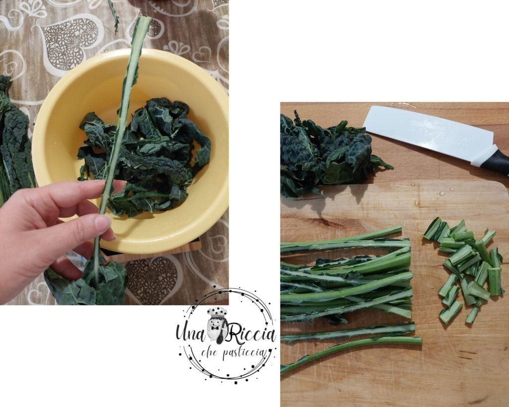 En este periodo preparo a menudo unas excelentes sopas de col negra o sopas de arroz y col negra, pero estas preparaciones solo requieren la parte de la hoja de la col y no las costillas. Mientras las limpiaba, se me ocurrió que en Abruzzo, por tradición, durante el periodo de Navidad se come el cardo con huevo, así que pensé en preparar la misma receta pero utilizando las costillas de la col negra. Esta es una excelente idea anti-desperdicio para reciclar una parte de esta verdura que de otro modo se desecharía. Con las hojas, además de las sopas, puedes preparar un pesto otoñal o unos maravillosos gnocchetti.
