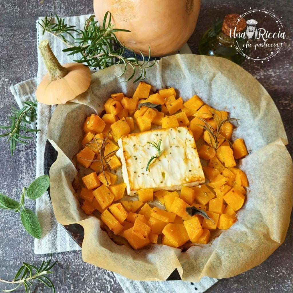 Una receta fácil y rápida de preparar que a menudo os salvará la cena creando un plato único donde la dulzura de la calabaza se casa a la perfección con la salinidad del queso griego por excelencia, todo potenciado por el aroma de salvia y romero y, para quien lo ame, un toque de guindilla picante. Además podéis enriquecer vuestra feta al horno con granillo de frutos secos o semillas de lino o semillas de sésamo tostadas y, ¿por qué no?, unas deliciosas aceitunas taggiasche.