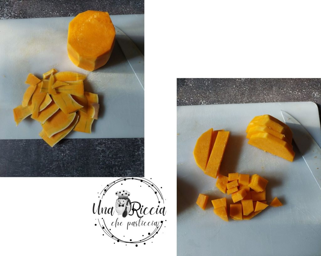 Tomamos la calabaza y la limpiamos quitando primero los extremos y luego la cáscara, la cortamos a la mitad y sacamos los hilos internos con la ayuda de una cuchara. Cuando hayamos terminado, cortamos la calabaza en dados de aproximadamente 2 cm por lado.