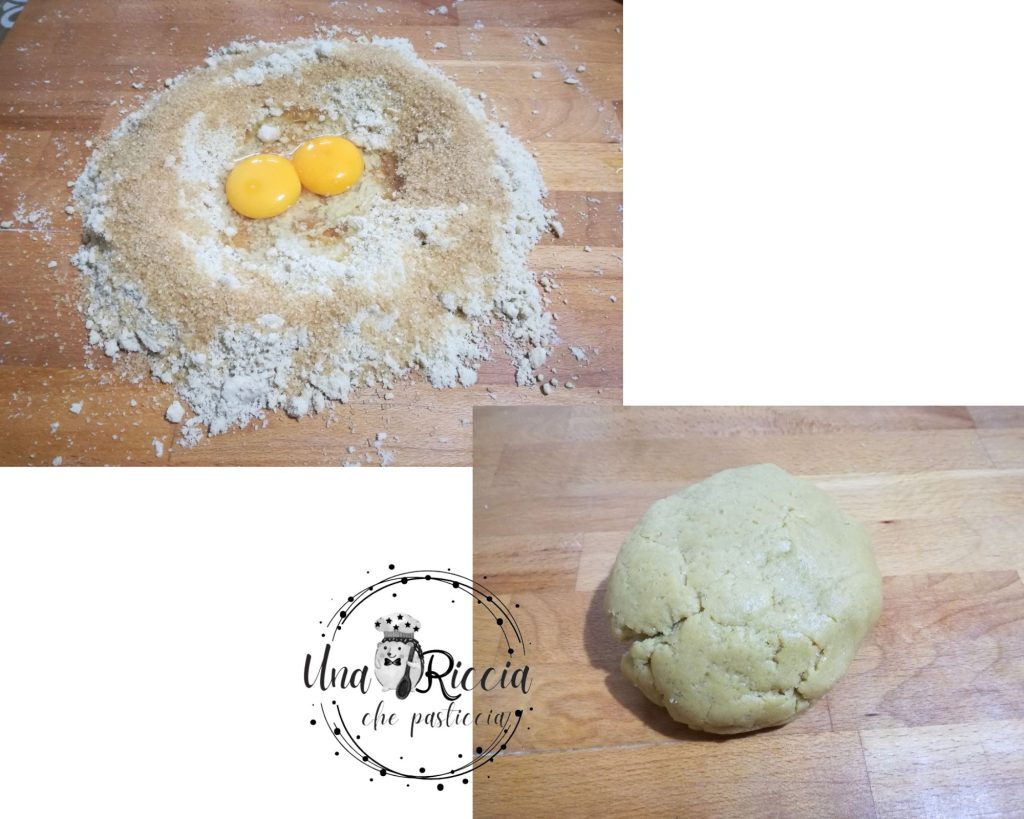 En una superficie de trabajo disponemos las harinas formando un volcán y en el centro ponemos la mantequilla fría cortada en trocitos y comenzamos a trabajarlos juntos, primero amasando y luego frotando los ingredientes entre las manos hasta obtener una mezcla con la consistencia precisamente de la arena.Reformamos un volcán y ponemos dentro el huevo, la yema, el aceite de semillas, el azúcar de caña y la pizca de sal, luego trabajamos la masa rápidamente para no calentar demasiado la mantequilla. Obtenemos una bola lisa y homogénea.