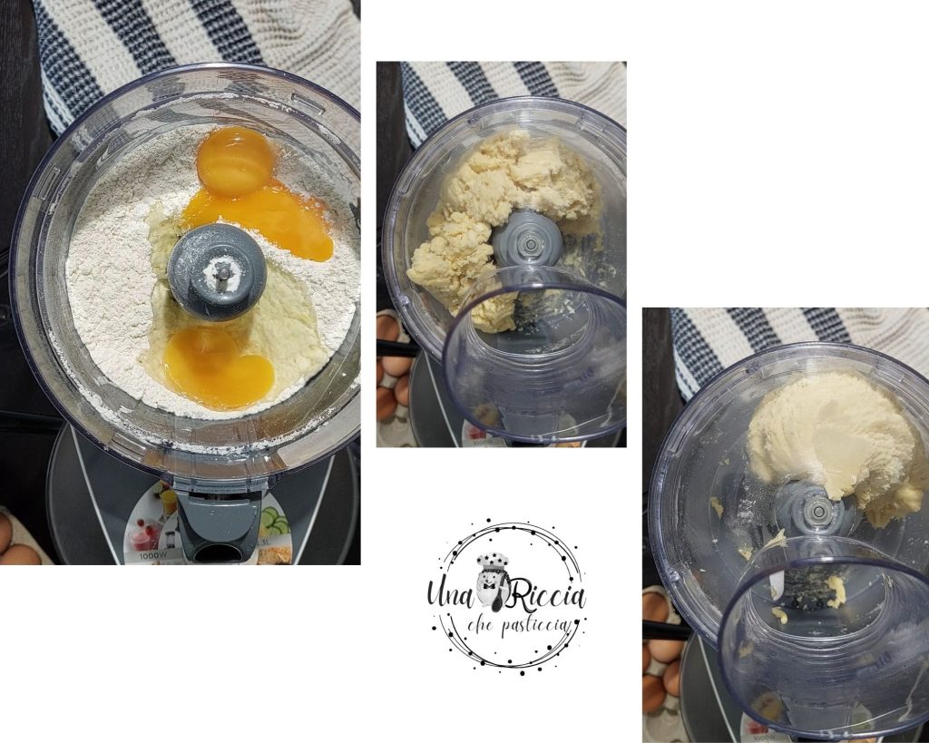 En el bol de la batidora ponemos la harina, el parmesano rallado, la sal y la mantequilla fría de la nevera cortada en trozos, cerramos con la tapa y accionamos haciendo que los ingredientes se mezclen como arena. No dejemos batir por mucho tiempo consecutivamente sino que actuemos de forma intermitente, así obtendremos una mezcla similar al queso rallado.