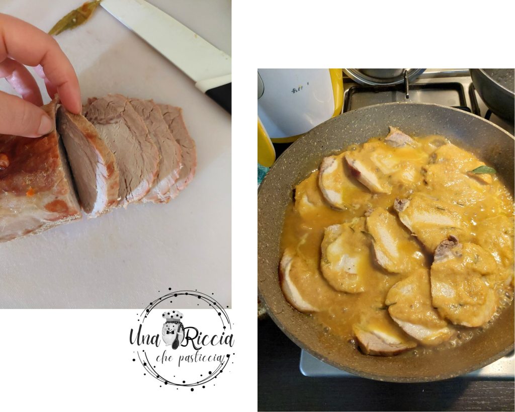 • Cortamos el lomo en rodajas de aproximadamente medio centímetro y lo volvemos a colocar en la sartén, cubrimos con la crema y lo calentamos ligeramente.