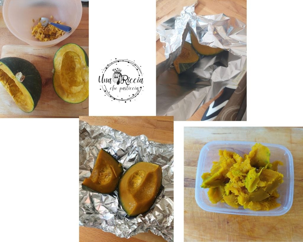 Primero debemos encargarnos de la calabaza, para poder obtener el puré que necesitaremos tomamos la calabaza, la lavamos, la cortamos a la mitad y la liberamos de filamentos y semillas (no las deseches, son excelentes para hacerlas crujientes) y luego la cortamos en trozos grandes. La envolvemos en papel de aluminio, la ponemos en una bandeja para horno y la horneamos en horno precalentado a una temperatura de 200 grados durante 35/40 minutos. Pasado el tiempo de cocción, la sacamos del horno y, con la ayuda de una cuchara, extraemos la pulpa de la piel.