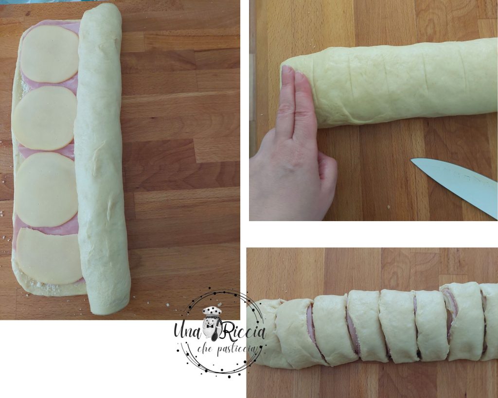 Ahora que la masa está rellena, tomamos uno de los lados largos y comenzamos a enrollarlo sobre sí mismo, apretando, pero no demasiado, mientras envolvemos para compactar. Una vez obtenido un cilindro, colocamos la parte del cierre en el fondo y luego podemos cortarlo. Debemos obtener piezas de un grosor de poco más de dos dedos. Para seguridad, marcamos con el cuchillo los puntos donde cortar y luego cortamos. Debemos obtener al final 12 rodajas.