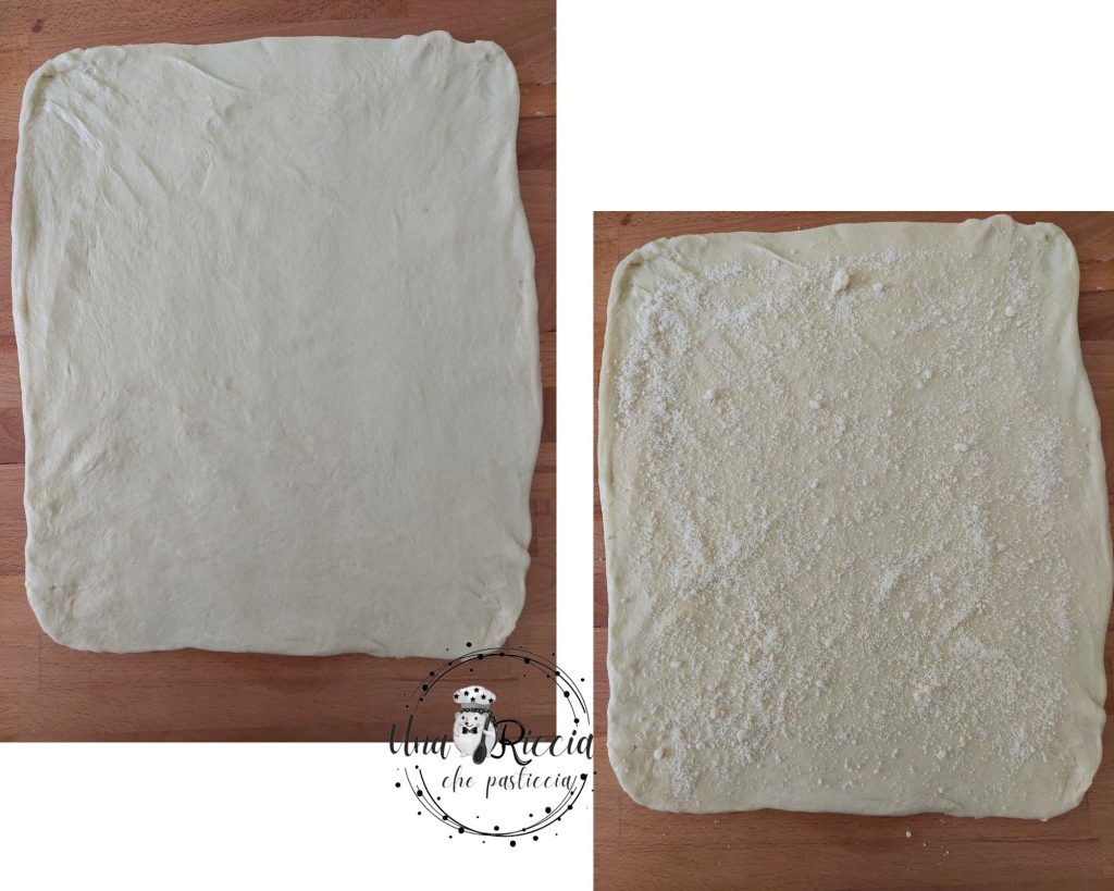 Tomamos la masa levada y la volcamos sobre una superficie de trabajo, la extendemos primero con las manos y luego con un rodillo hasta formar un rectángulo de aproximadamente 35×50 y espolvoreamos con la mitad del parmesano rallado.