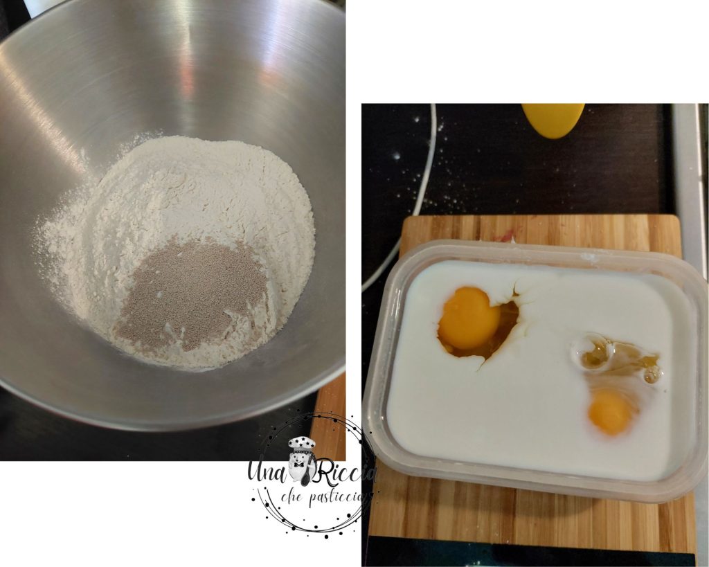 Accionamos la amasadora con el gancho de gancho y comenzamos a mezclar la harina con la levadura, después añadimos la leche con los huevos en hilo, amasamos a velocidad media-baja hasta que comience a formarse una masa sólida. En este punto, comenzamos a incorporar la mantequilla blanda, un trozo a la vez y esperando que el anterior esté absorbido antes de añadir otro.