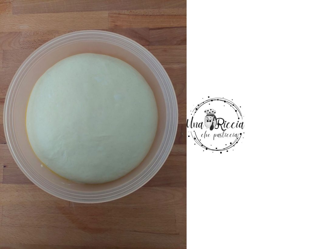 Cuando te queden un par de trozos de mantequilla por añadir, agrega la sal y luego continúa con la mantequilla. Deja trabajar la máquina hasta que la masa esté bien unida al gancho y, por lo tanto, completamente separada de los lados formando una bola. Volcamos sobre una superficie de trabajo, le damos forma esférica y la dejamos fermentar en un cuenco ligeramente engrasado y cubierto con plástico durante unas 2 horas y hasta que duplique su tamaño.