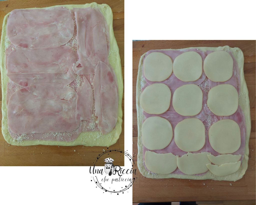 Sobre el parmesano colocamos las otras lonchas de jamón y luego cubrimos todo con las lonchas de provola ahumada. También en esta segunda capa, presta atención a dejar los lados largos libres.