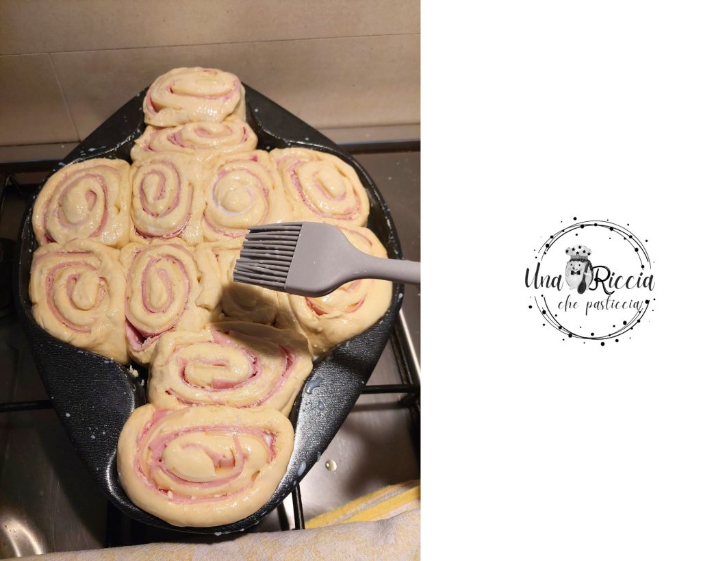 Una paloma salada para poner en el centro de la mesa y que cada uno pueda tomar un trozo para compartir un momento de convivencia en los días de fiesta. Se trata de una masa levada que, después de estirarse, se rellena, se corta y luego se hornea. De esta manera se crean las porciones individuales típicas del pastel de rosas. Mi paloma salada está rellena con parmesano, jamón cocido y provola ahumada, pero naturalmente puedes elegir los rellenos que más te gusten, incluso puedes hacerla vegetariana utilizando calabacines a la parrilla en lugar del jamón.