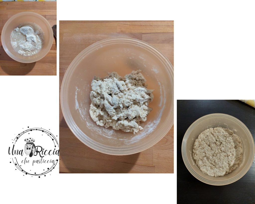 Ponemos en un cuenco toda la harina, añadimos la levadura de cerveza deshidratada y luego vertemos los 320 gramos de agua de los ingredientes para la biga. Mezclamos rápidamente con una cuchara de madera o una espátula sin dejar harina suelta y sin compactar demasiado, el resultado debe ser una mezcla suelta. Cubrimos con film transparente (o una gorra) y dejamos fermentar de un mínimo de 12 horas a un máximo de 16 horas a temperatura ambiente.