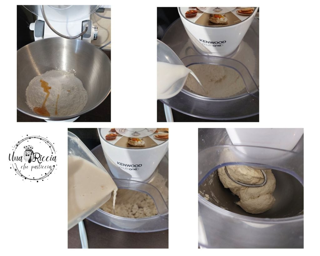 En la amasadora con el gancho colocamos las harinas, el azúcar y la miel y activamos, luego añadimos la leche y continuamos amasando a velocidad media, mientras la masa gira, añadimos también la levadura disuelta y dejamos que la masa se una bien.
