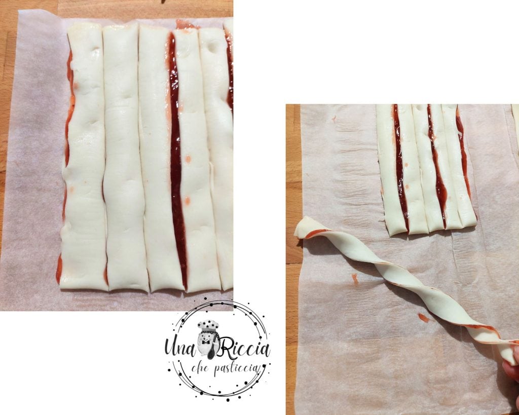 Con un cuchillo bien afilado o con un cortador de pasta, cortamos 12 tiras aproximadamente del mismo tamaño. Primero las he dividido por la mitad y luego he hecho las tiritas. Una vez obtenidas las partes de hojaldre, tomamos una, la estiramos ligeramente y la enrollamos girando con una mano hacia adelante y con la otra hacia atrás para obtener el efecto ‘twist’.