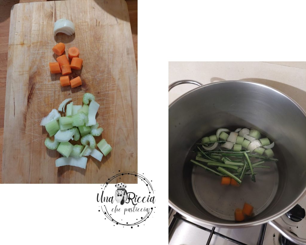 Para realizar nuestra sopa necesitamos el caldo de verduras, así que empezamos por ahí. En una olla vertemos el agua y añadimos la zanahoria, la cebolla, el apio, unos tallos de col rizada y la sal y dejamos hervir durante una hora. Si no tienes tiempo, puedes utilizar uno de esos caldos ya listos.