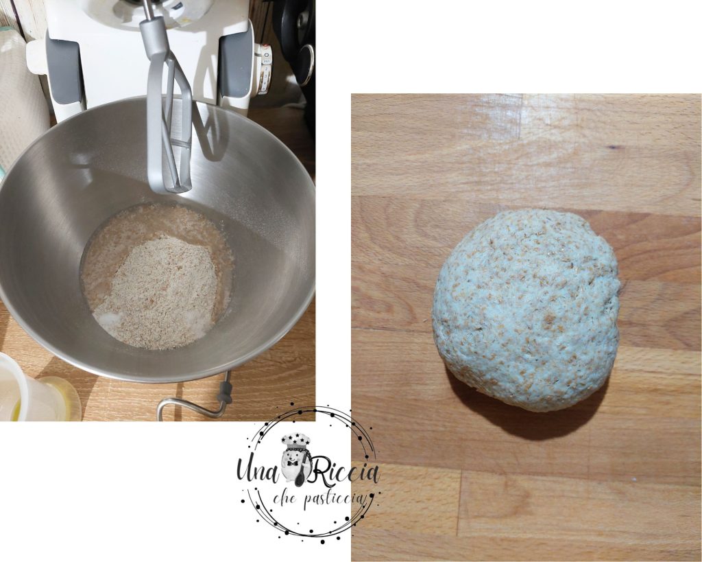 Podemos amasar esta falsa brisé tanto en una tabla de amasar como en una amasadora. Yo he utilizado mi Kenwood Multione para ser aún más rápida. En el tazón de la batidora ponemos la harina integral, la sal y el bicarbonato y mezclamos rápidamente, después añadimos el aceite de oliva y el agua y dejamos amasar hasta obtener un bollo liso y homogéneo. Envolvámoslo en film plástico y pongámoslo en la nevera por media hora.