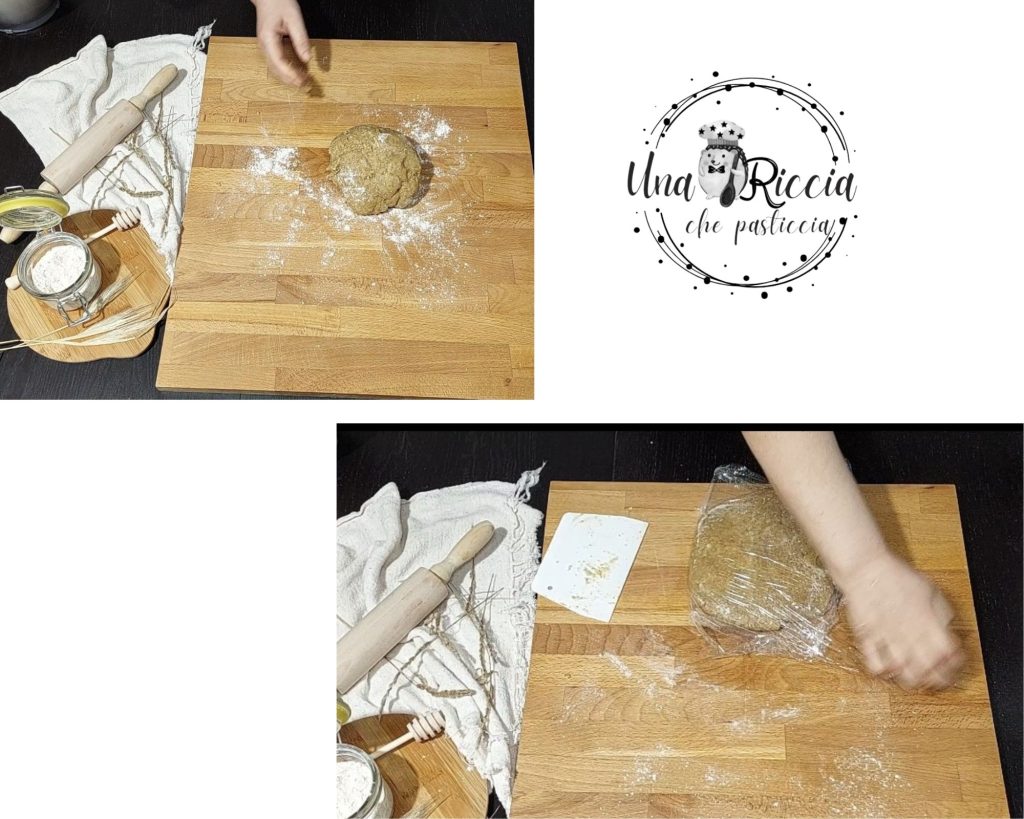 Trasladamos la masa a una superficie de trabajo y amasamos rápidamente para formar una bola. Envolvemos la pasta frolla de miel en film, la achatamos y la ponemos en el frigorífico a reposar y endurecer por al menos una hora, mejor si son dos.