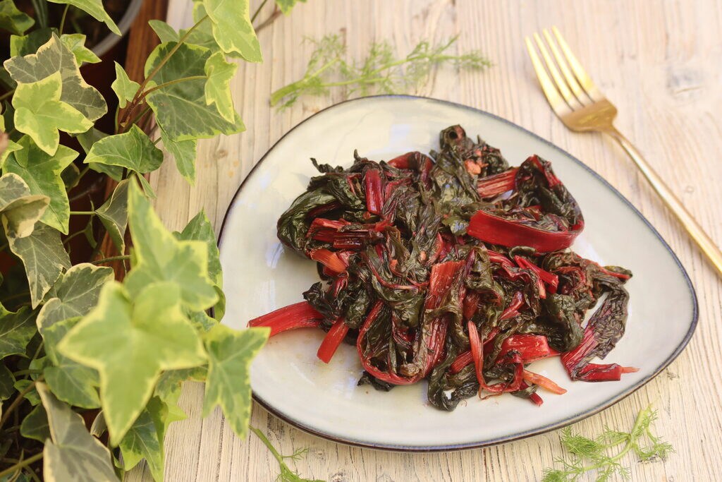 Acelga roja estofada con un color brillante e intenso que ni siquiera se pierde al cocinar y es precioso. La acelga roja contiene ácido fólico y favorece la salud cardiovascular gracias a la presencia de potasio y antioxidantes, contiene vitamina C y hierro, por lo tanto, ayuda a combatir la anemia. Refuerza el sistema inmunológico y mejora la salud de la piel, gracias también a la cantidad de agua que contiene. Pero lo que la hace especial es el sabor además del color, buena y sencilla en la cocina se puede utilizar de varias maneras diferentes, además de en guarniciones se pueden rellenar ravioles o pastas frescas en general.