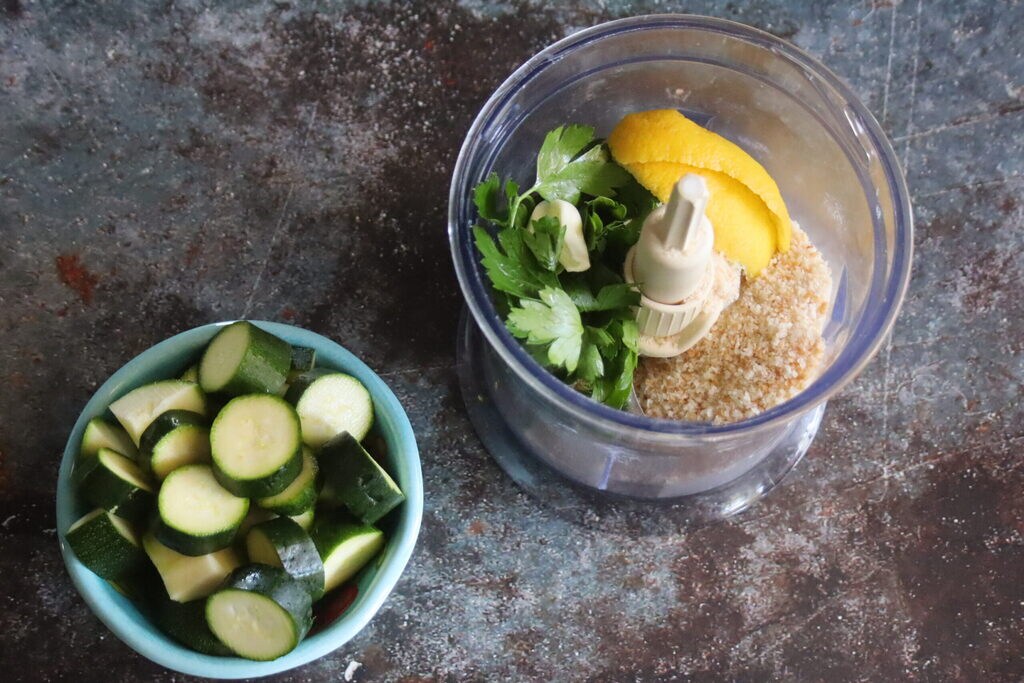En la picadora puse el calabacín con el perejil y el ajo, la cáscara de medio limón con un poco de pan rallado, lo piqué hasta hacerlo homogéneo, añadí el resto del pan rallado, una pizca de sal y mezclé.