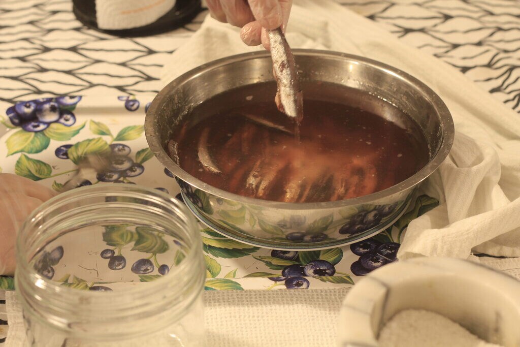 Colócalos en un tarro con aceite de oliva virgen extra. Yo no le quité la espina, pero si lo prefieres, puedes hacerlo.