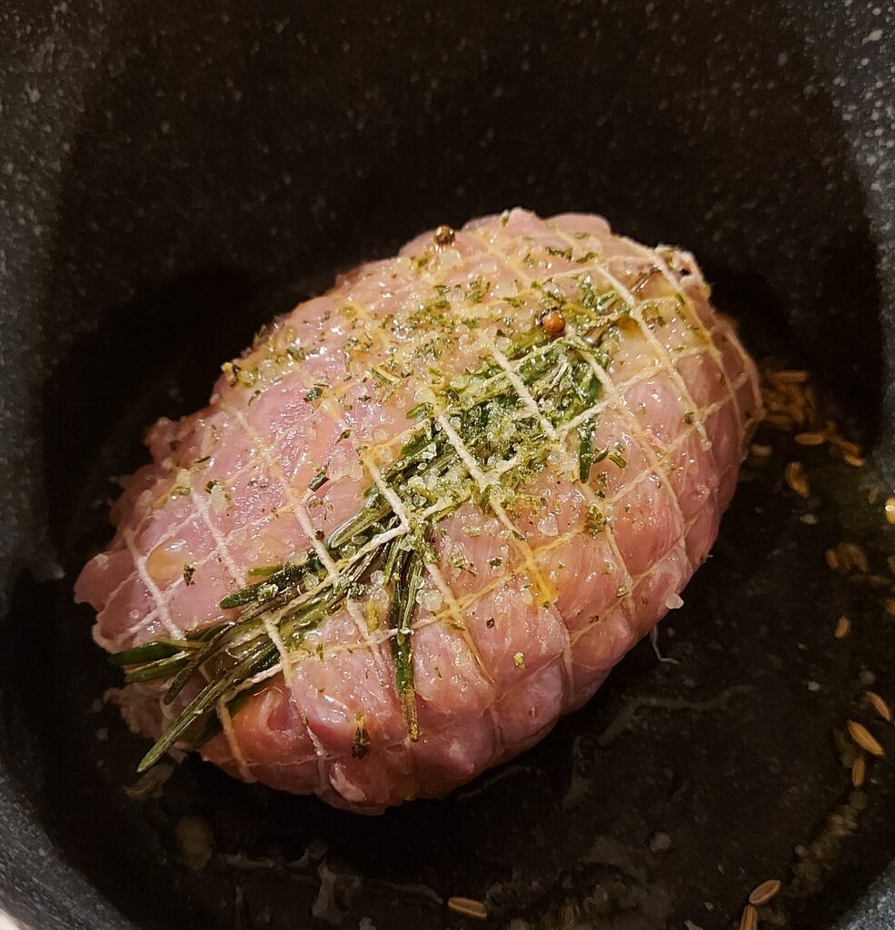 • Condimentad el pecho de pollo con la sal y el romero, cerradlo utilizando la red para asados. Doradlo directamente en la olla a presión con el aceite de oliva virgen extra y el ajo, desglasad con el vino blanco y añadid, siempre cortados en cubitos, las zanahorias, el apio, la manzana y los tomates. Naturalmente todo excepto la berenjena que la usaréis como guarnición para acompañar el asado de pollo. Cerrad la olla a presión con su tapa y, una vez que empiece a silbar, bajad el fuego y cocinad durante 30 minutos. Mientras tanto, freíd la berenjena en cubitos con toda la piel.