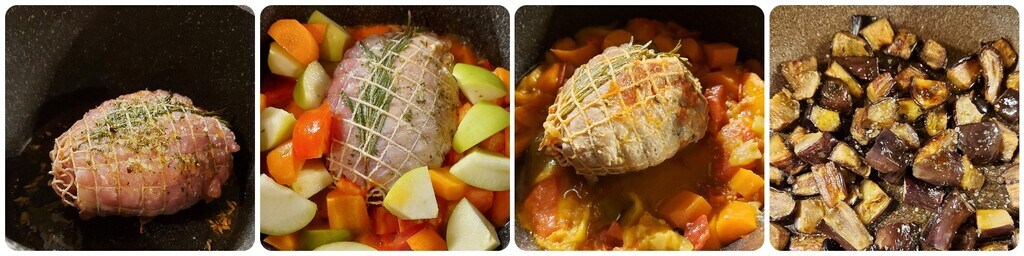 • Condimentad el pecho de pollo con la sal y el romero, cerradlo utilizando la red para asados. Doradlo directamente en la olla a presión con el aceite de oliva virgen extra y el ajo, desglasad con el vino blanco y añadid, siempre cortados en cubitos, las zanahorias, el apio, la manzana y los tomates. Naturalmente todo excepto la berenjena que la usaréis como guarnición para acompañar el asado de pollo. Cerrad la olla a presión con su tapa y, una vez que empiece a silbar, bajad el fuego y cocinad durante 30 minutos. Mientras tanto, freíd la berenjena en cubitos con toda la piel.