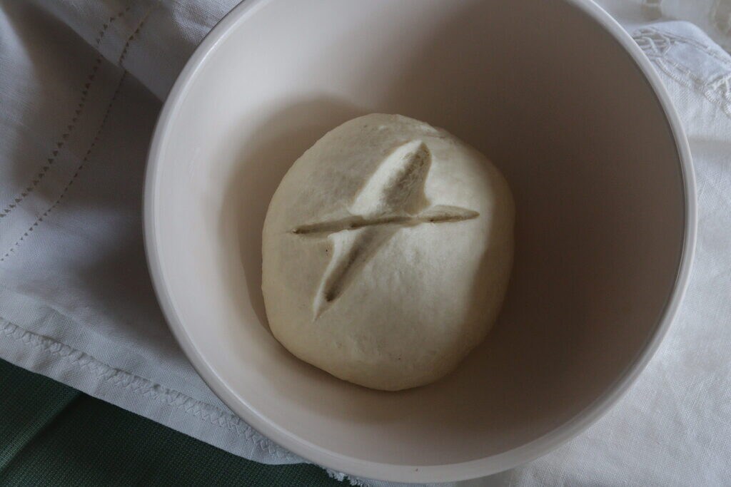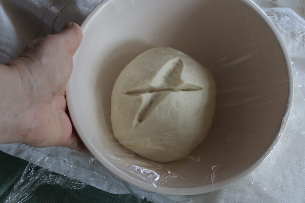 Hago dos cortes transversales y cubro con la película transparente. Dejo que fermente durante 2 horas en el horno a 30° en modo fermentación de masa. Si no tienes esta función en el horno, puedes dejar que fermente en un lugar seco y siempre cubierto durante 3 horas.