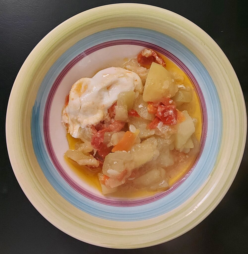 Calabacín largo patatas y huevos. Me contaba una amiga que la primera vez que cocinó el calabacín largo lo hizo con toda la piel y, naturalmente, el resultado fue un poco un desastre… luego aprendió. Este calabacín típico siciliano se cultiva en verano pero también se encuentra en otoño avanzado. Es una planta muy particular porque se enreda y los calabacines cuelgan literalmente desde lo alto, es un espectáculo verlos. Cuando lo cocino, hago una cantidad abundante y luego lo pongo en porciones en el congelador para disfrutarlo en invierno simplemente así con parmesano encima o añadiendo pasta o como hoy con los huevos. Un plato simple, rápido y sobre todo sabroso que gusta a todos en la familia. Ya conocéis mi receta calabacín largo o serpiente, aquí pongo el enlace en azul. El calabacín largo antes solo se encontraba en el sur de Italia, hoy afortunadamente también lo encuentro en mi verdulería, me gusta muchísimo y en el período de producción consumo mucho. Siempre preparo también algún tarro en aceite para el invierno.