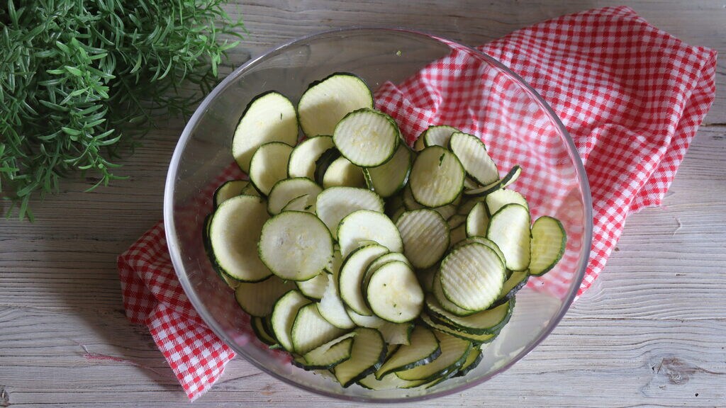 Después de lavar los calabacines, dejad la piel y con la mandolina cortadlos en rodajas.