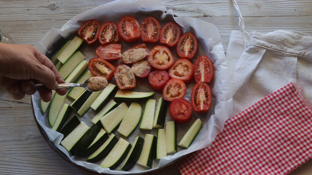 • Partid también por la mitad los tomatitos y colocarlos en la bandeja junto a los calabacines. Preparad el pan rallado con la sal, la pimienta, el aceite, el pimentón, la albahaca picada y mezclad todo, esparcir sobre las verduras.