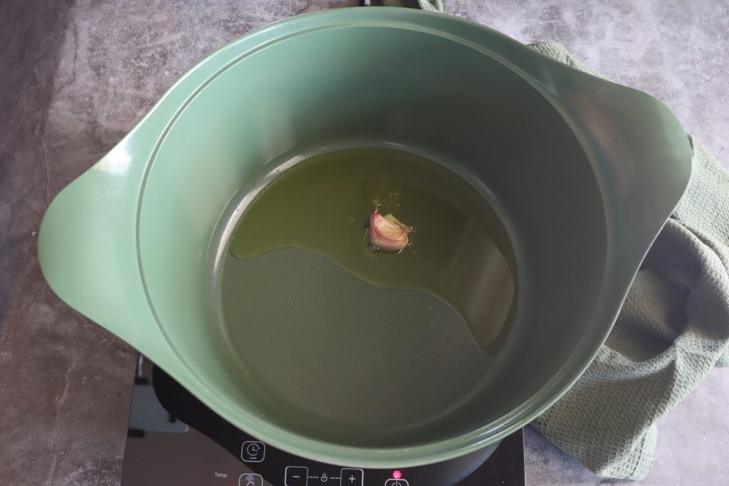 • Preparo este acompañamiento de caponata de verduras con la Increíble Cocotte cada vez que nos reunimos en familia con hijos y nietos. Somos muchísimos y luego preparo los tuppers para llevar. Doro un diente de ajo con la cáscara, que luego quitaré, para perfumar el aceite.