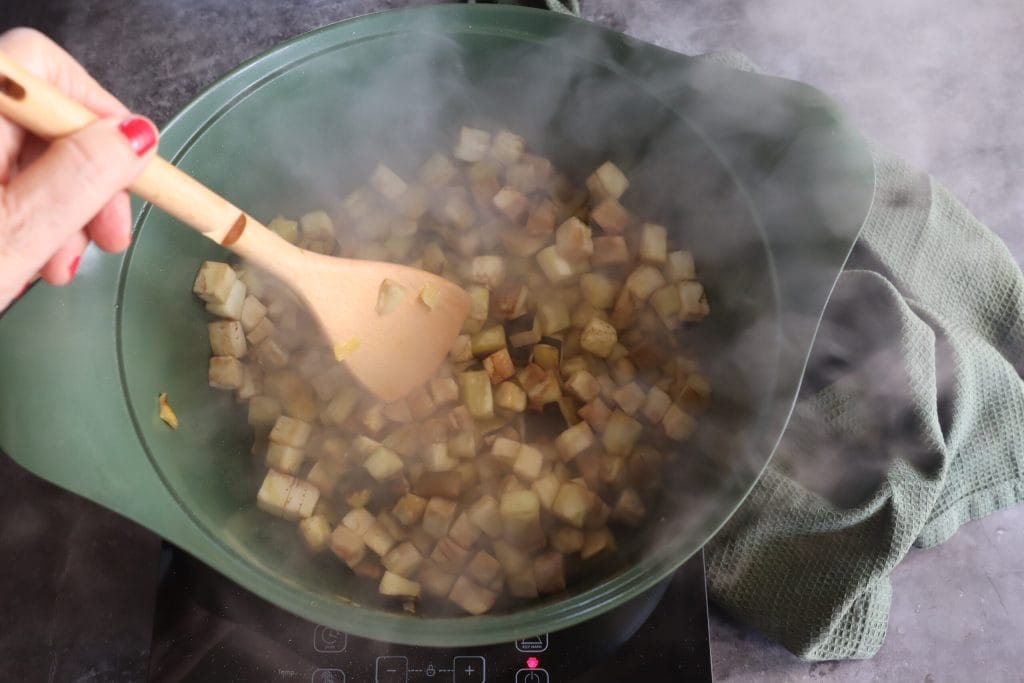• Mientras tanto, también preparo las berenjenas, peladas y cortadas en trozos. Retiro los pimientos de la Cocotte.