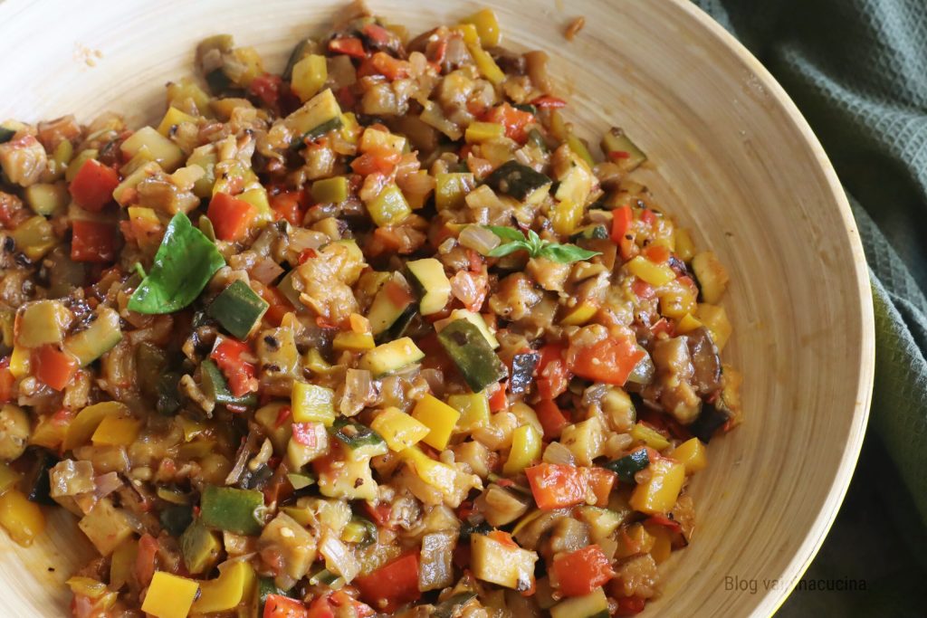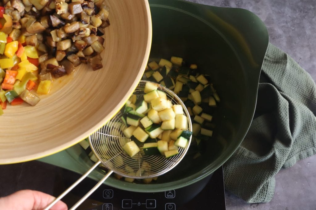 • Nuevamente retiro las berenjenas cocidas de la Cocotte y las coloco junto a los pimientos cocidos en un bol.