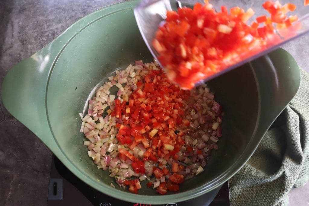 • Agrego los tomates rojos, también cortados en trocitos pequeños.
