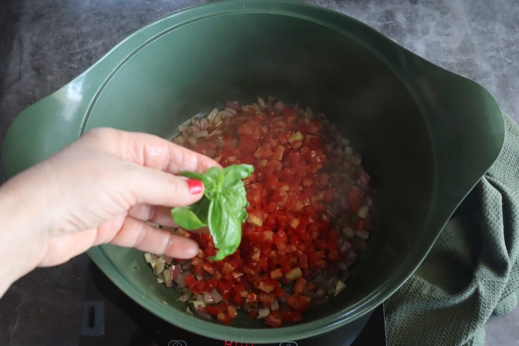 • Agrego una generosa cantidad de albahaca al terminar la cocción.