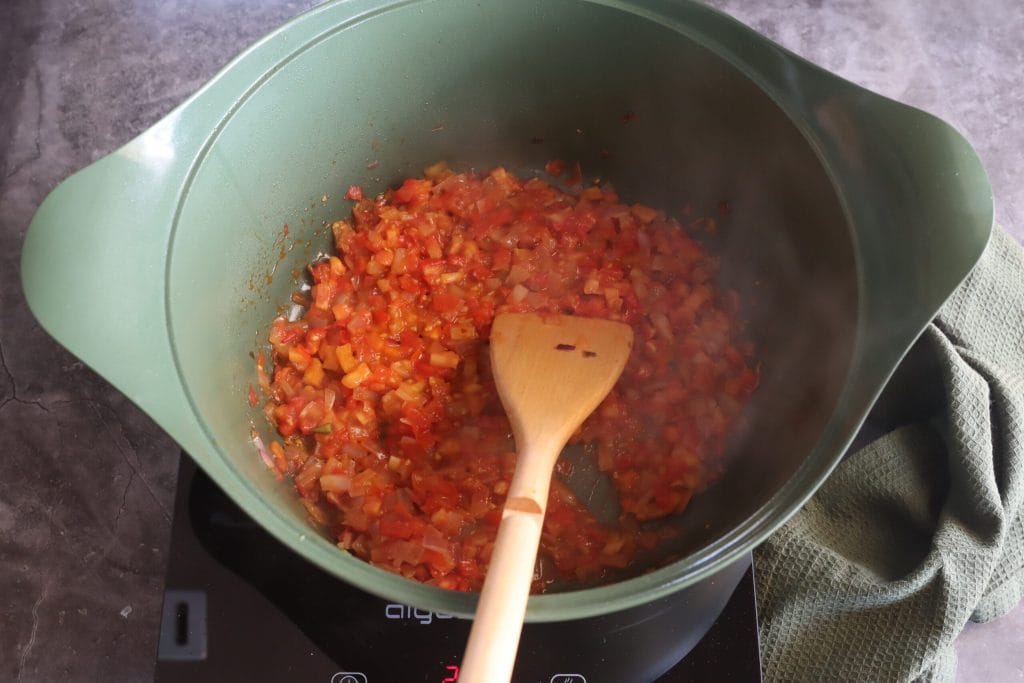 • Volcamos las tres verduras estofadas en el tomate cocido.