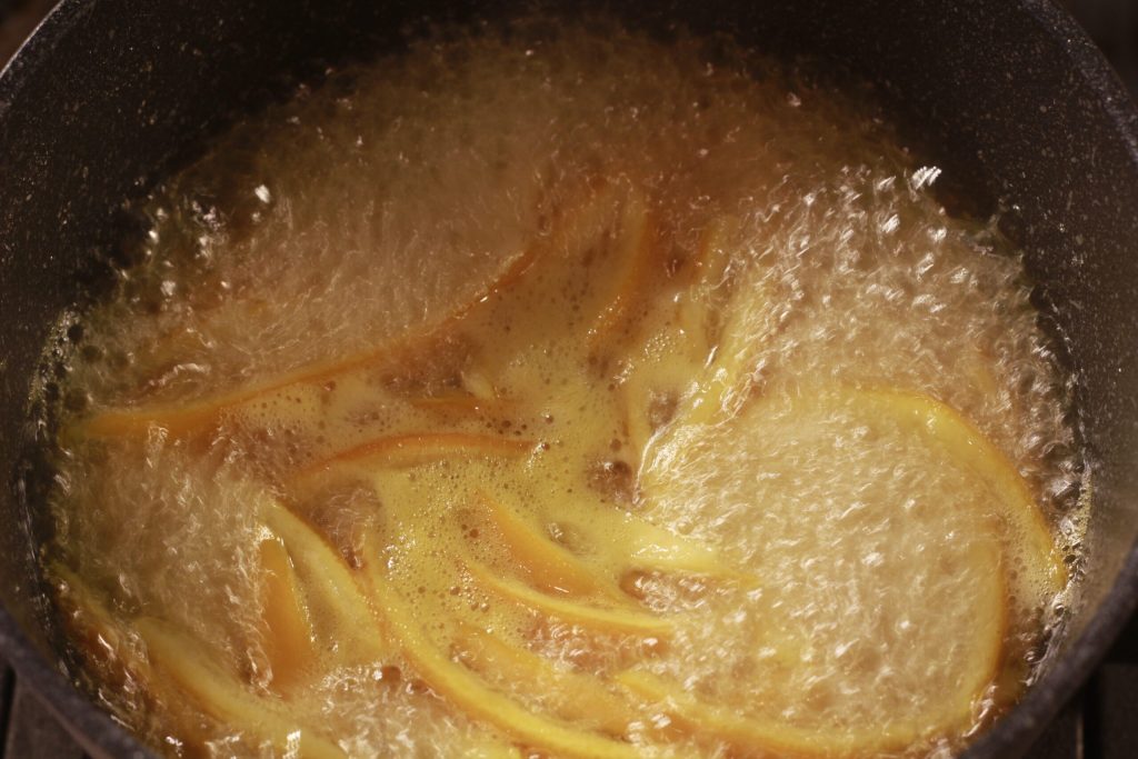 Coced las cáscaras de naranja hasta que el agua se haya evaporado y el azúcar esté cristalizado; os llevará al menos 15 o 20 minutos.