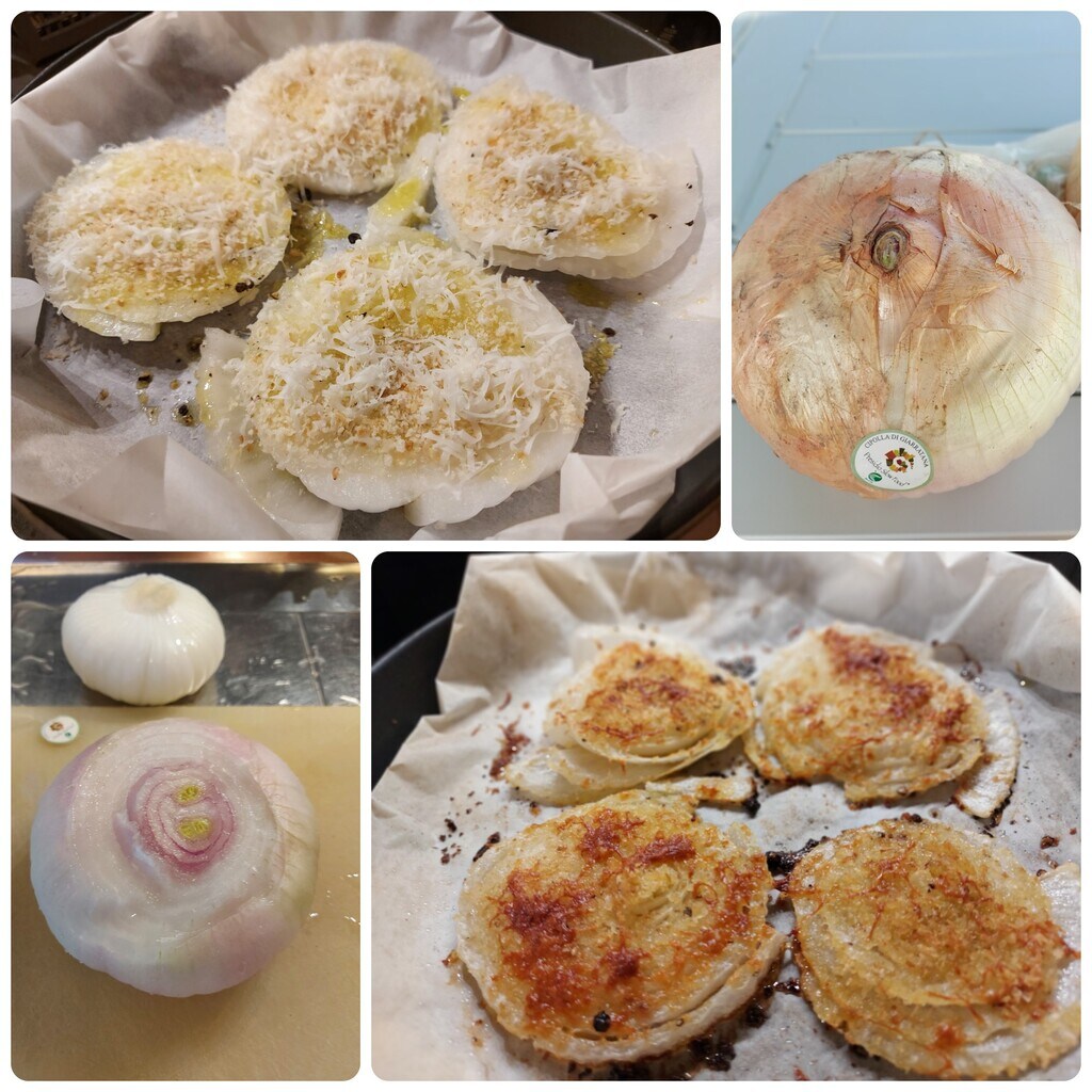 Cebollas de Giarratana gratinadas, producto típico del pequeño municipio ibleo presidio Slow Food, Giarratana para ser exactos, uno de los centros más pequeños de la provincia de Ragusa, más que un pueblo, un pequeño y encantador Burgo. Producto típico siciliano utilizado en varios platos como la scaccia ragusana o cruda en ensaladas por su dulzura.