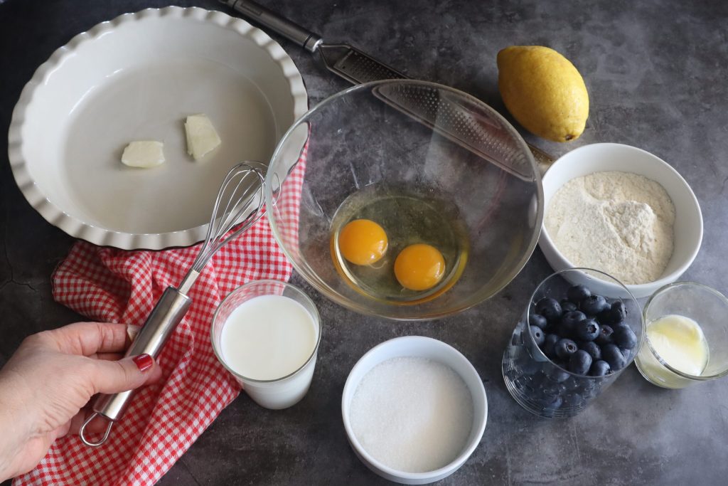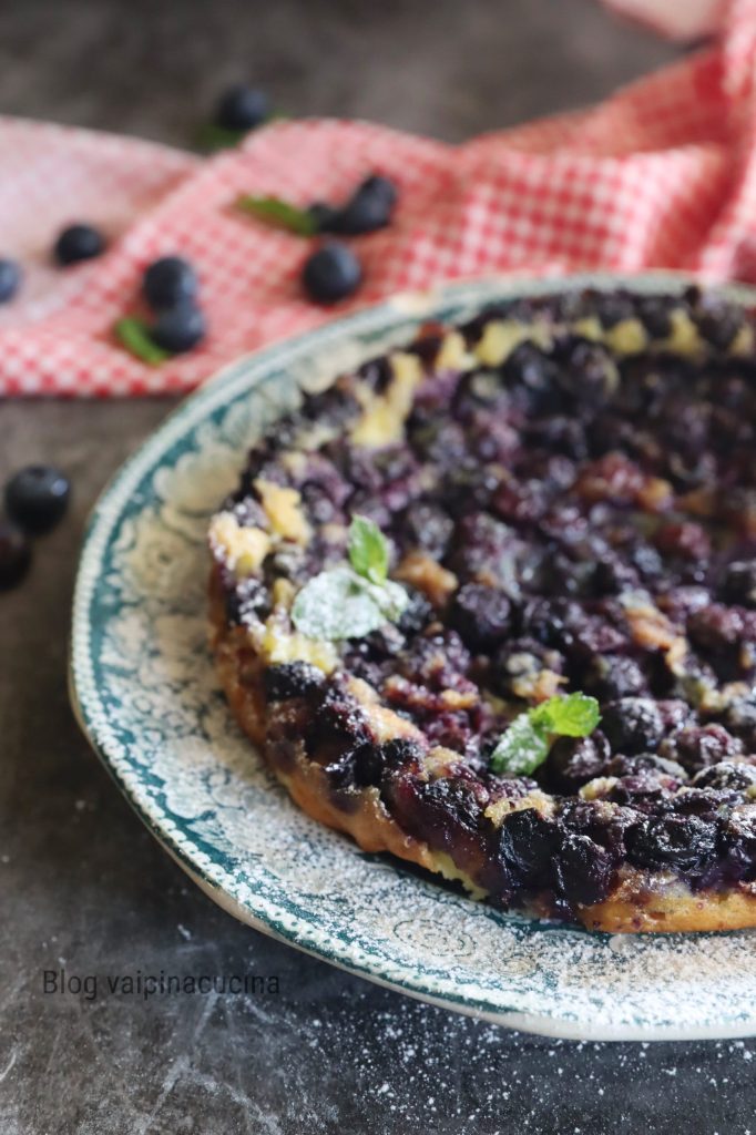 Clafoutis con arándanos, aunque en realidad la receta original prevé solo cerezas negras y rigurosamente con el hueso para no perder el jugo cuando se quita. Clafoutis designa un dulce francés y precisamente del Limosín, en el centro-sur de Francia, una zona atravesada por el Macizo Central y poco poblada, con la capital Limoges. Este dulce se compone de cerezas negras, pero se puede preparar también con otra fruta. Yo, de hecho, hoy he utilizado arándanos y debo decir que ha salido buenísimo. El nombre clafoutis deriva del verbo «clafir», que significa «llenar», y esto se refiere precisamente a las cerezas que deben llenar el dulce. El compuesto se asemeja a la de las crêpes con cocción al horno y, una vez cocido, tiene una consistencia suave y húmeda como la crema o incluso un pudin.