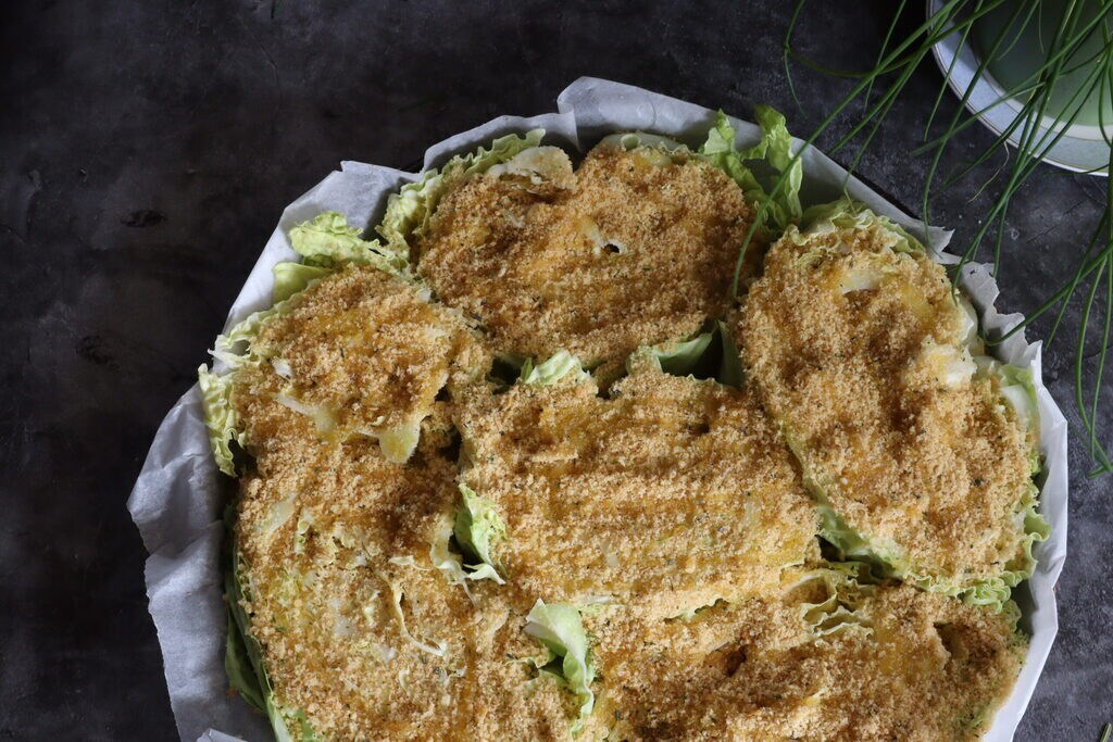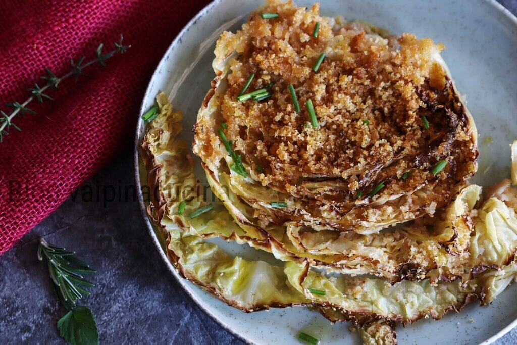 Col lombarda gratinada al horno sencilla, una verdadera novedad para mí que siempre he preparado esta verdura sólo guisada y algunas veces cruda en ensalada con vinagre, aceite y mostaza. Suelo preparar siempre la achicoria gratinada y hoy quise experimentar también con la col lombarda usando pan rallado aromatizado con pimentón dulce. La primera regla es nunca tirar el pan duro, tarde o temprano siempre encontramos un uso, como hoy para esta receta. Normalmente lo pongo en el vaso de la trituradora junto con el ajo, el perejil, la cáscara de limón, el tomillo y la menta, digamos lo que ofrece mi huerto en ese momento, ya que nunca faltan las plantas aromáticas en mi jardín, tanto para decorar como, sobre todo, para perfumar los platos.