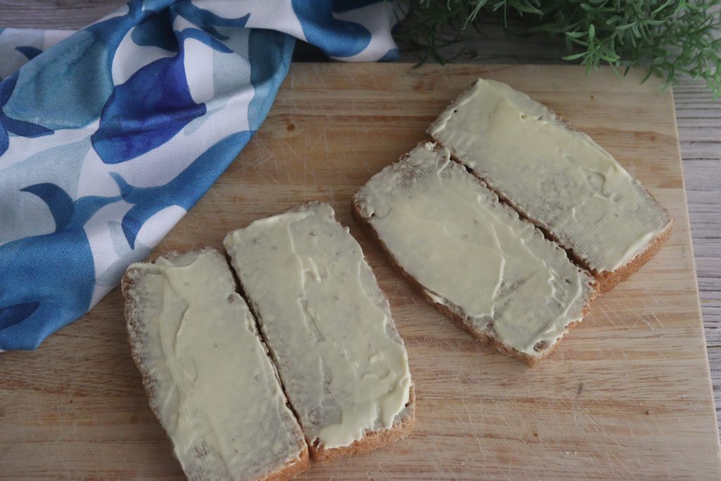 En cuatro rebanadas de pan de centeno, ustedes pueden probar con otro pan integral si prefieren, unta una cantidad generosa de mayonesa falsa preparada en casa con el yogur griego, una cucharadita de pimentón, el aceite de oliva virgen extra y la sal. Mezcla por unos segundos con el batidor de mano y la mayonesa falsa está lista.