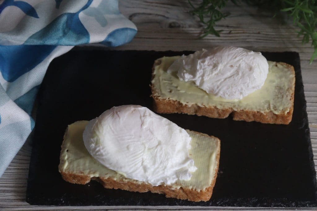 Prepara los huevos escalfados, también conocidos como huevos poché, así: coloca una cacerola con dos litros de agua al fuego, con 2 cucharadas de vinagre y ligeramente salada. Apenas el agua hierva, introduce el huevo quebrado y baja el fuego, deja cocinar por 3 minutos. Con una espumadera saca el huevo del agua y colócalo en el plato por unos segundos para que se temple. Ponlo sobre la rebanada de pan con la mayonesa falsa.