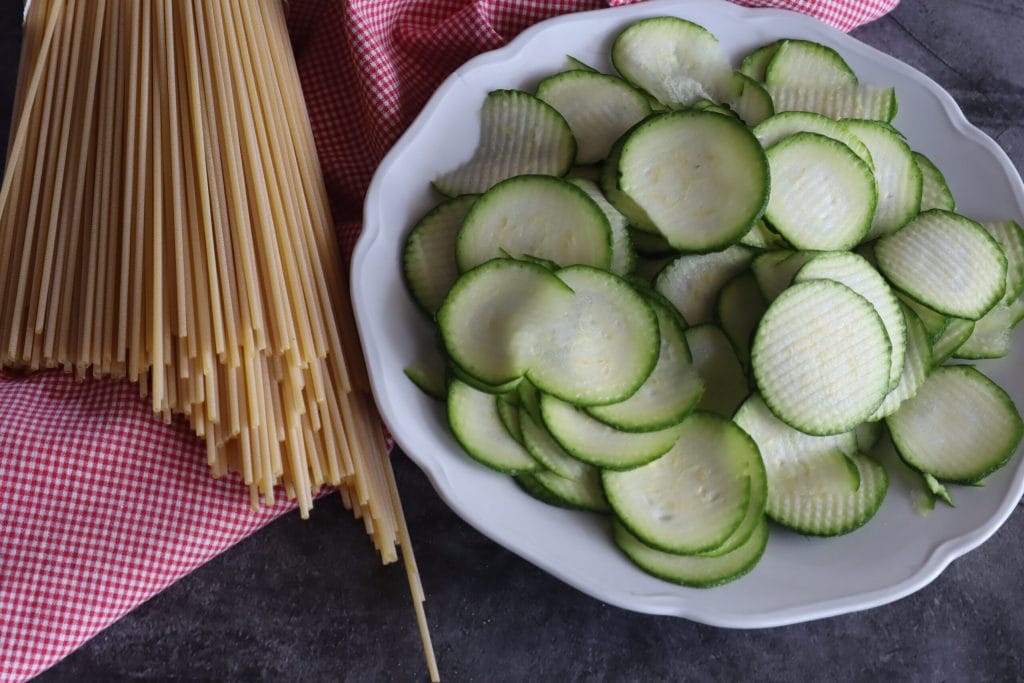 Sin pelar los calabacines, después de lavarlos, córtalos en rodajas finas con la mandolina.