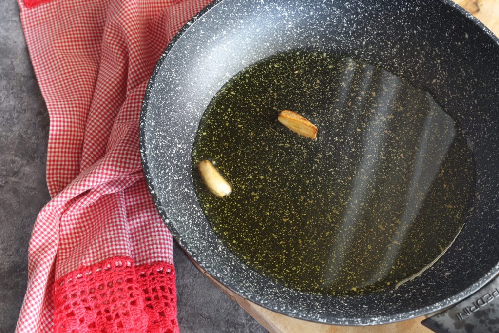 Retira el aceite de cacahuete y, en la misma sartén, dora un diente de ajo con dos cucharadas de aceite de oliva virgen extra.