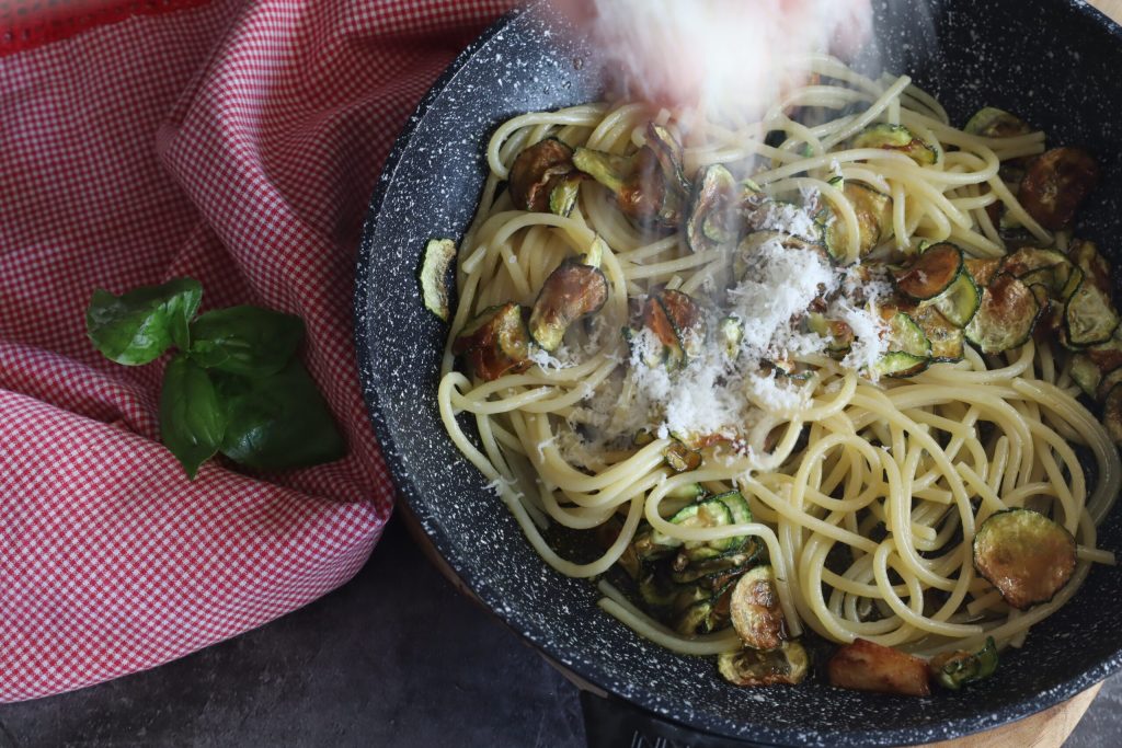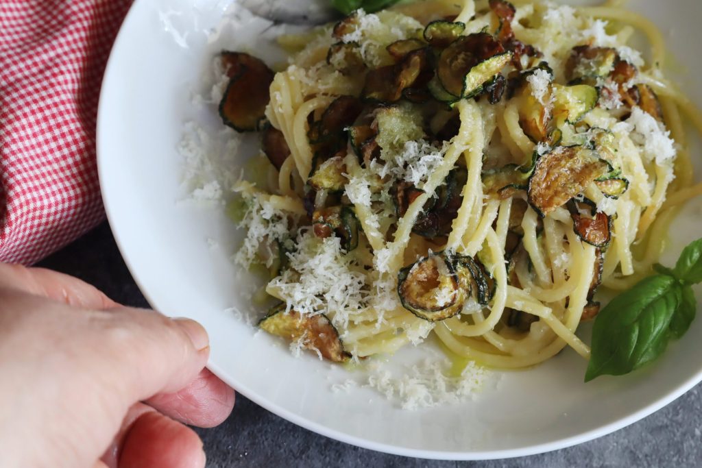 Espaguetis a la Nerano, una pequeña fracción del municipio de Massa Lubrense en Campania, donde parece que es allí el origen de este plato de espaguetis con calabacines fritos y el provolone del Monaco, originario de los Montes Lattari. Este queso se asemeja mucho al caciocavallo añejo y aporta una cremosidad única al plato. Para quienes, como yo, adoran los espaguetis, es obvio que cualquiera sea el condimento es un punto a favor, pero os aseguro que estos son realmente estupendos. Si además utilizáis el provolone del Monaco, entonces será perfecto: bueno es decir poco.