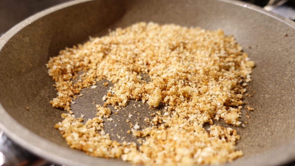 Mientras tanto, pasa en la sartén con el aceite, la miga de pan y tuéstala.